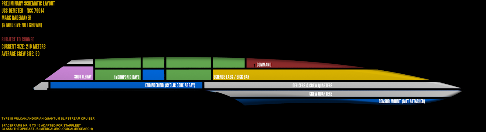 A small deck layout for the Demeter, IF it stays at it's current 216 meter size. It might be too small for the desired hydroponic bays capacity. I might size it up a deck or 2.